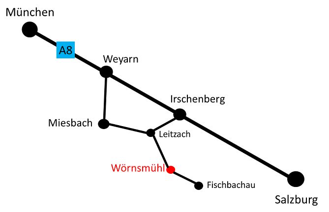 - Wenn Sie auf der Autobahn A8 Richtung München unterwegs sind: Nehmen Sie die Ausfahrt Irschenberg und fahren in Richtung Miesbach. In der Ortschaft Jedling biegen Sie links Richtung Leitzach ab. In Leitzach nehmen Sie die Abzweigung nach Fischbachau und fahren bis Wörnsmühl.
